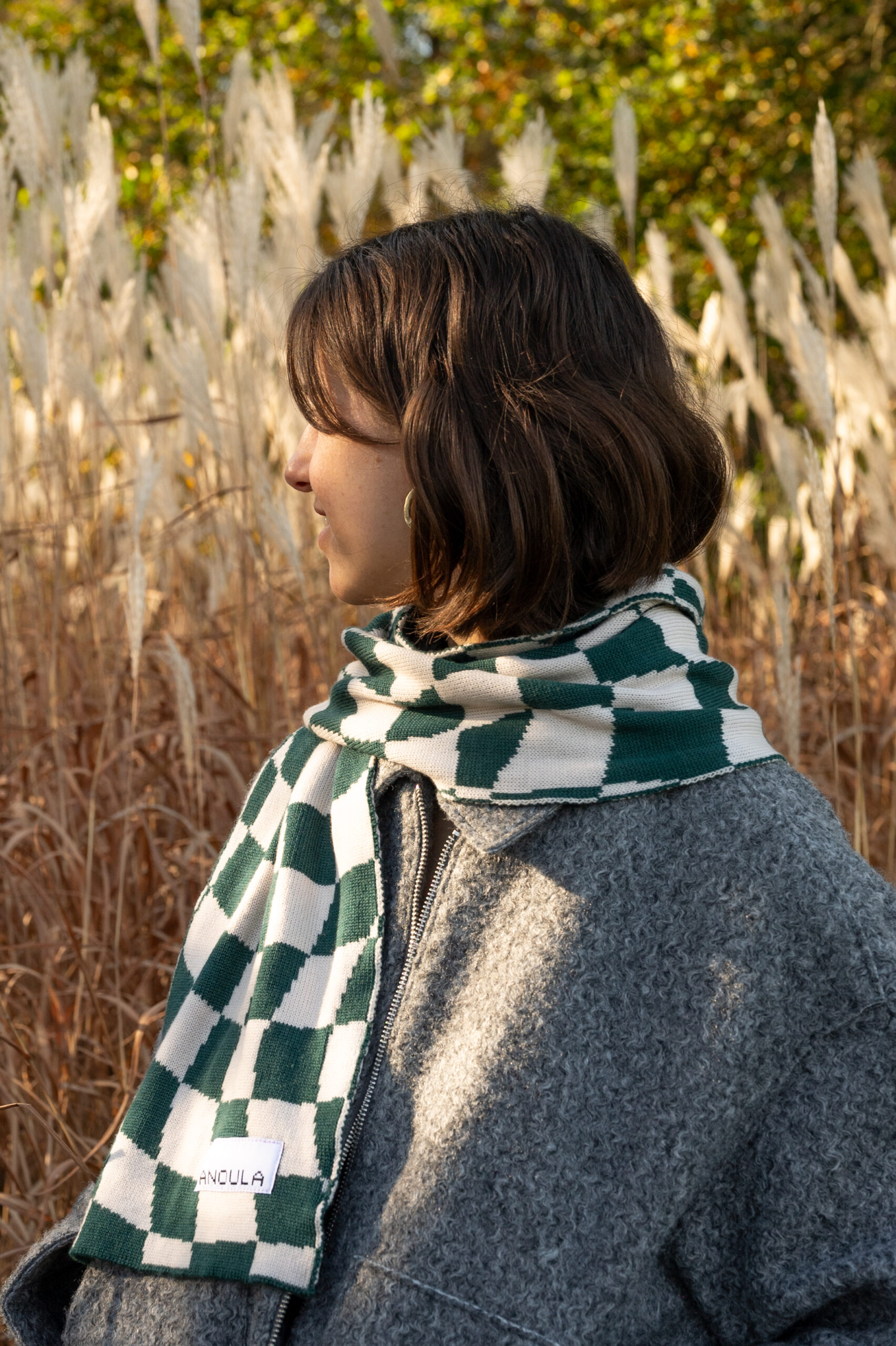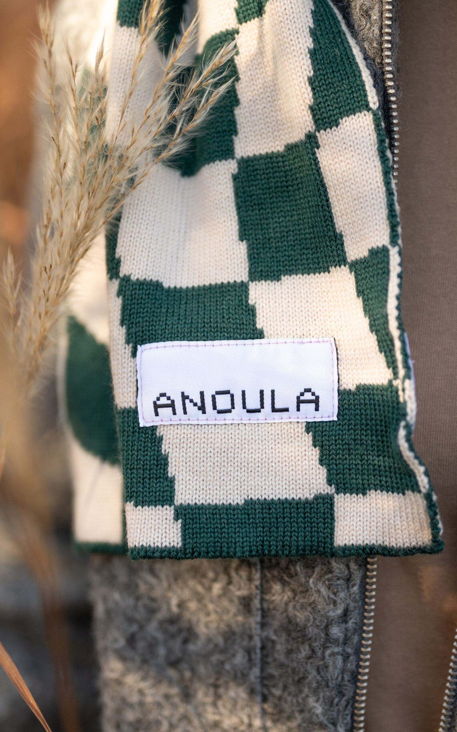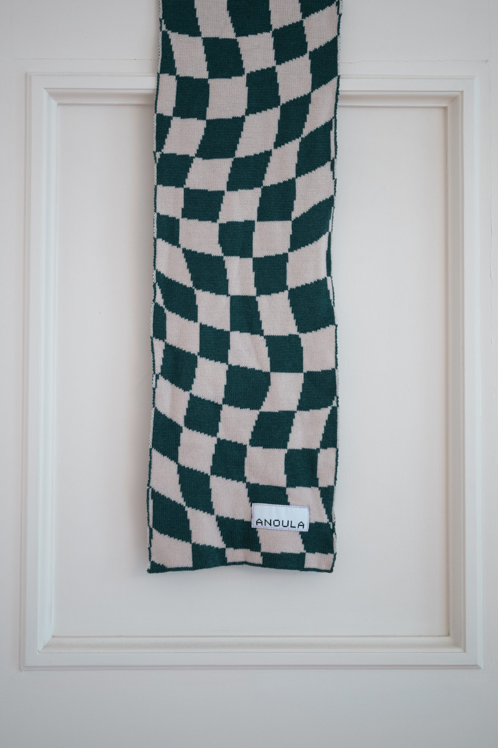 Der Schal ist zweifarbig und wendbar. Das Muster auf der Vorderseite erscheint auf der Rückseite farblich gespiegelt. Gestrickt wurde der Schal auf meiner Kniterate Strickmaschine in Aschaffenburg.